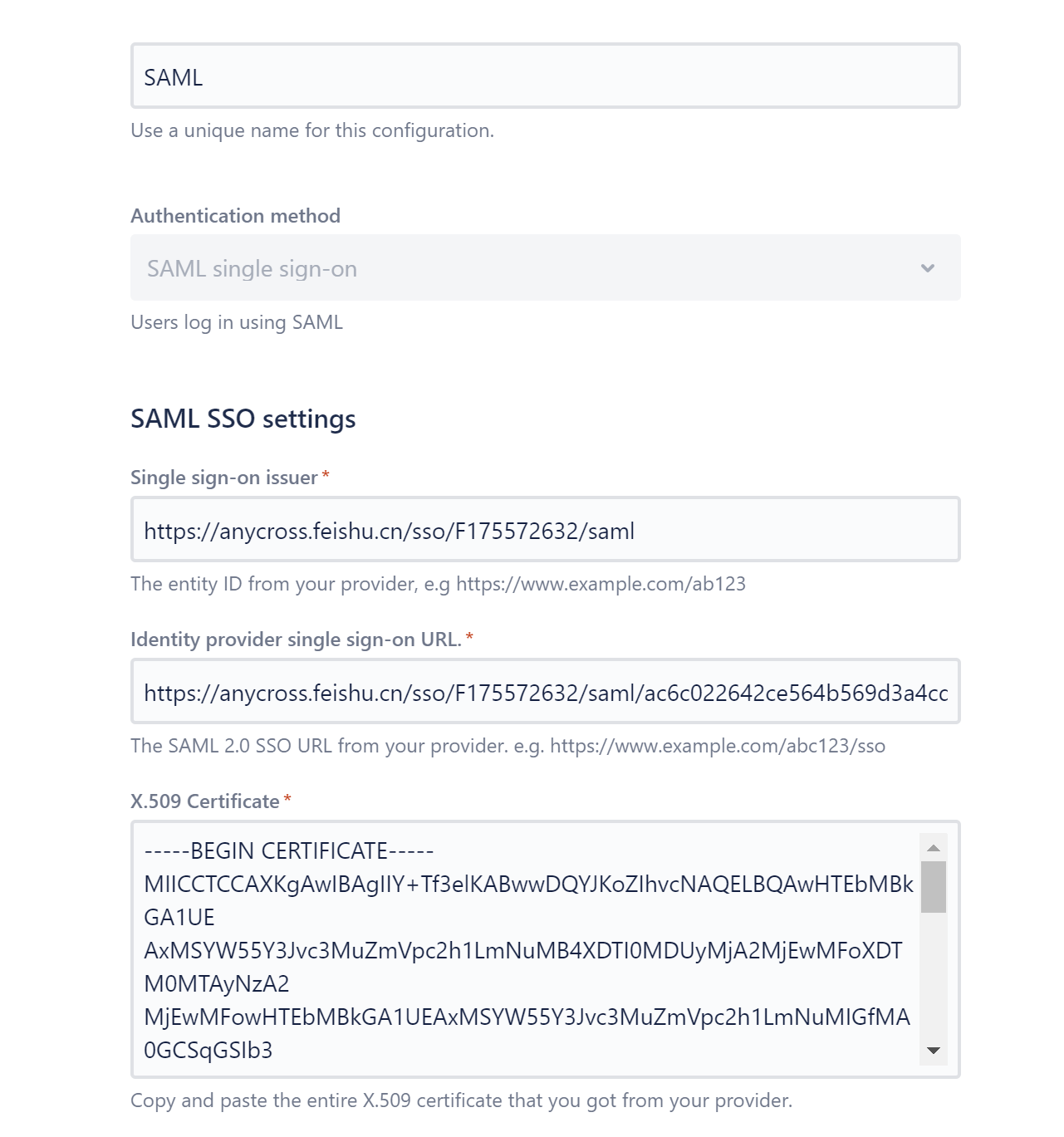 Identity provider single sign-on URL 填写飞书上的”认证请求端点“