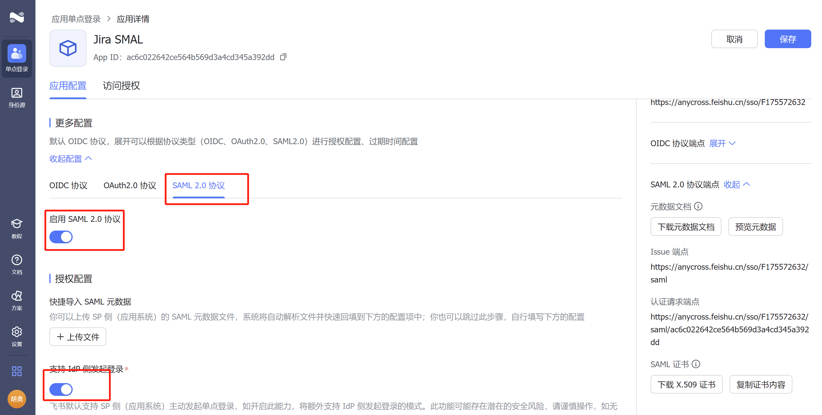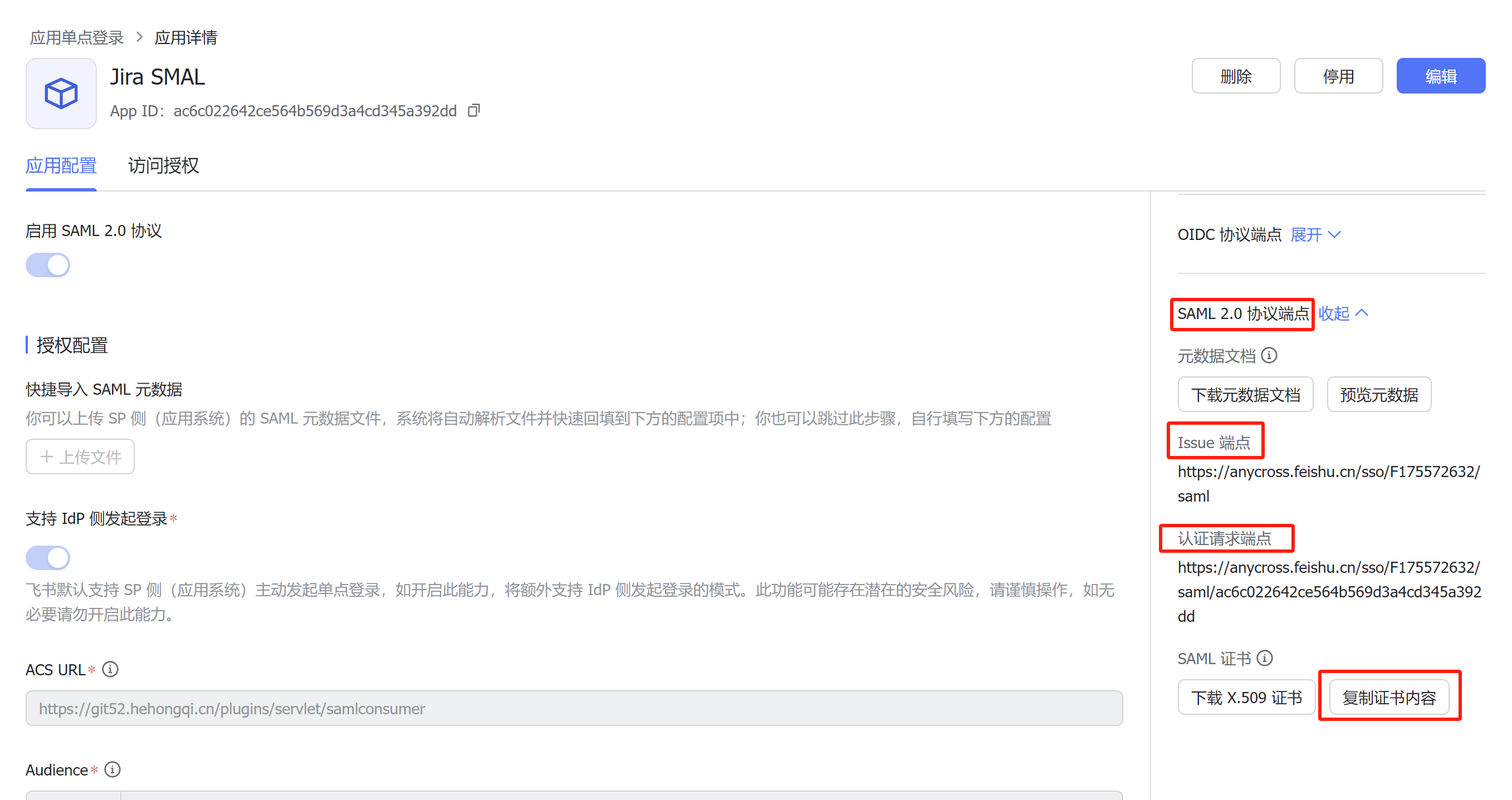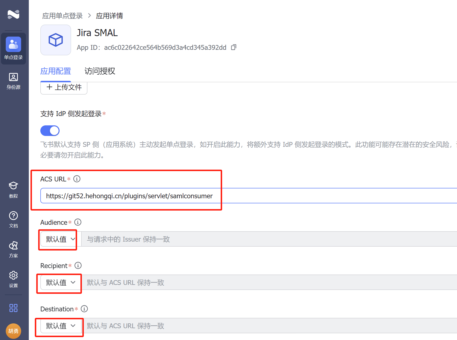 Assertion Consumer Service URL (ACS URL),填写到飞书应用上对应的地方。