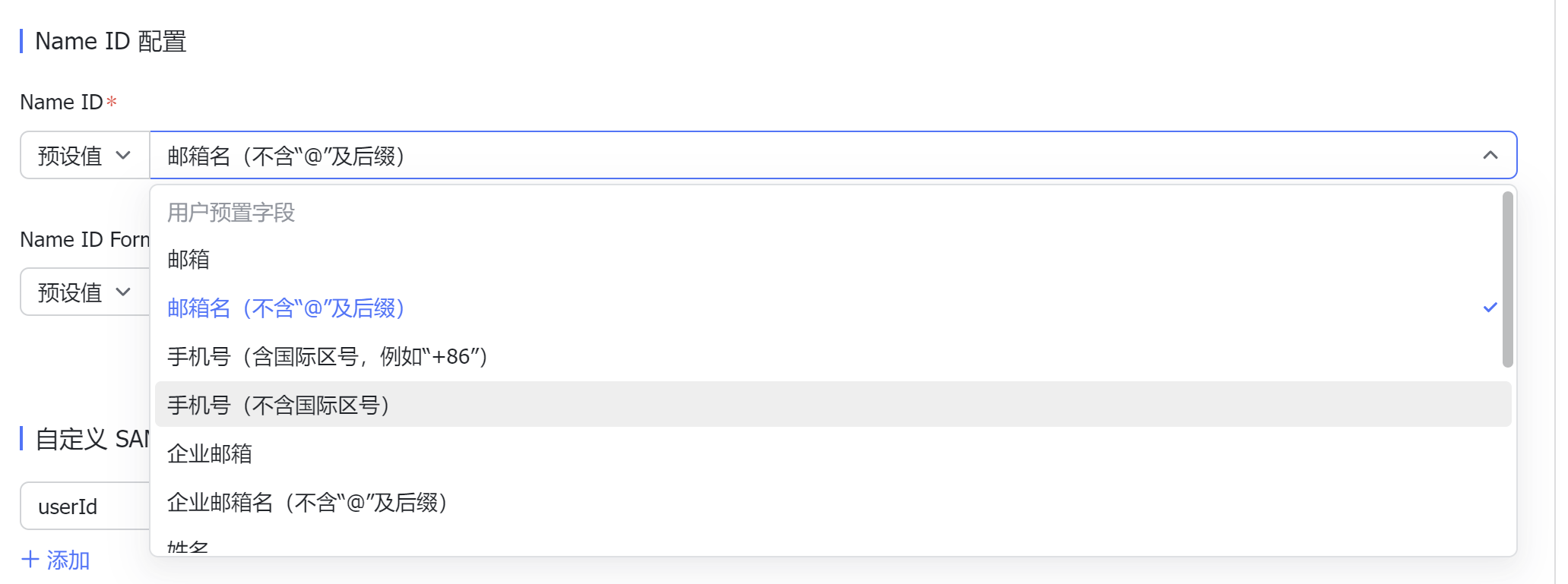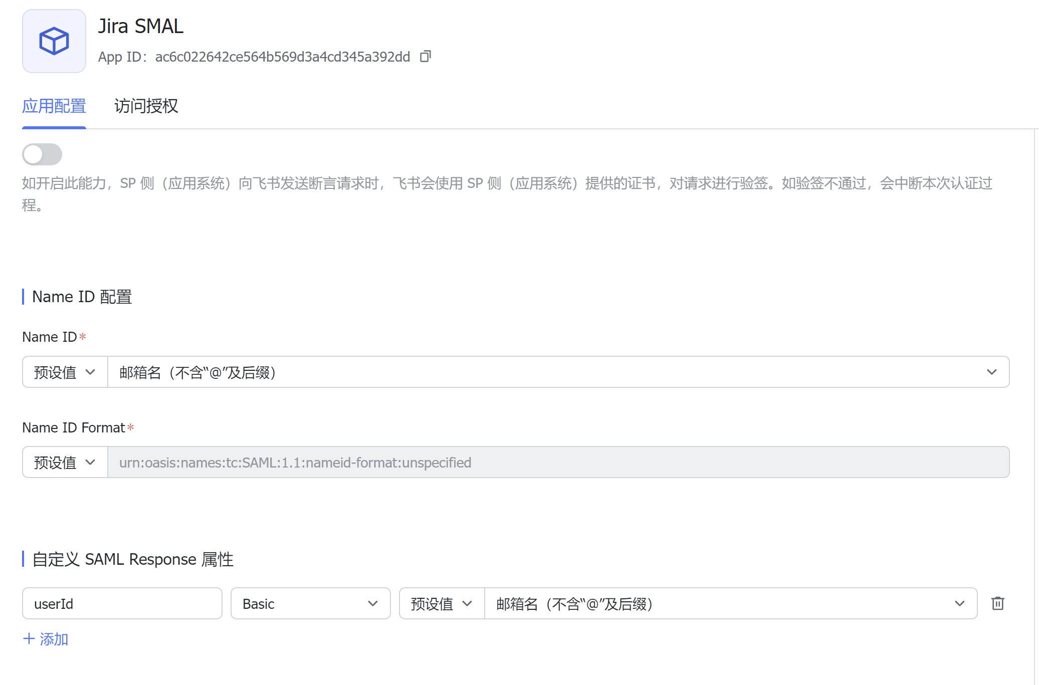 自定义属性userId,经测试这个值没有实际作用,但是不加跳转会失败,可以见这个文档(https://support.atlassian.com/atlassian-account/docs/login-issues-related-to-single-sign-on-sso/)中